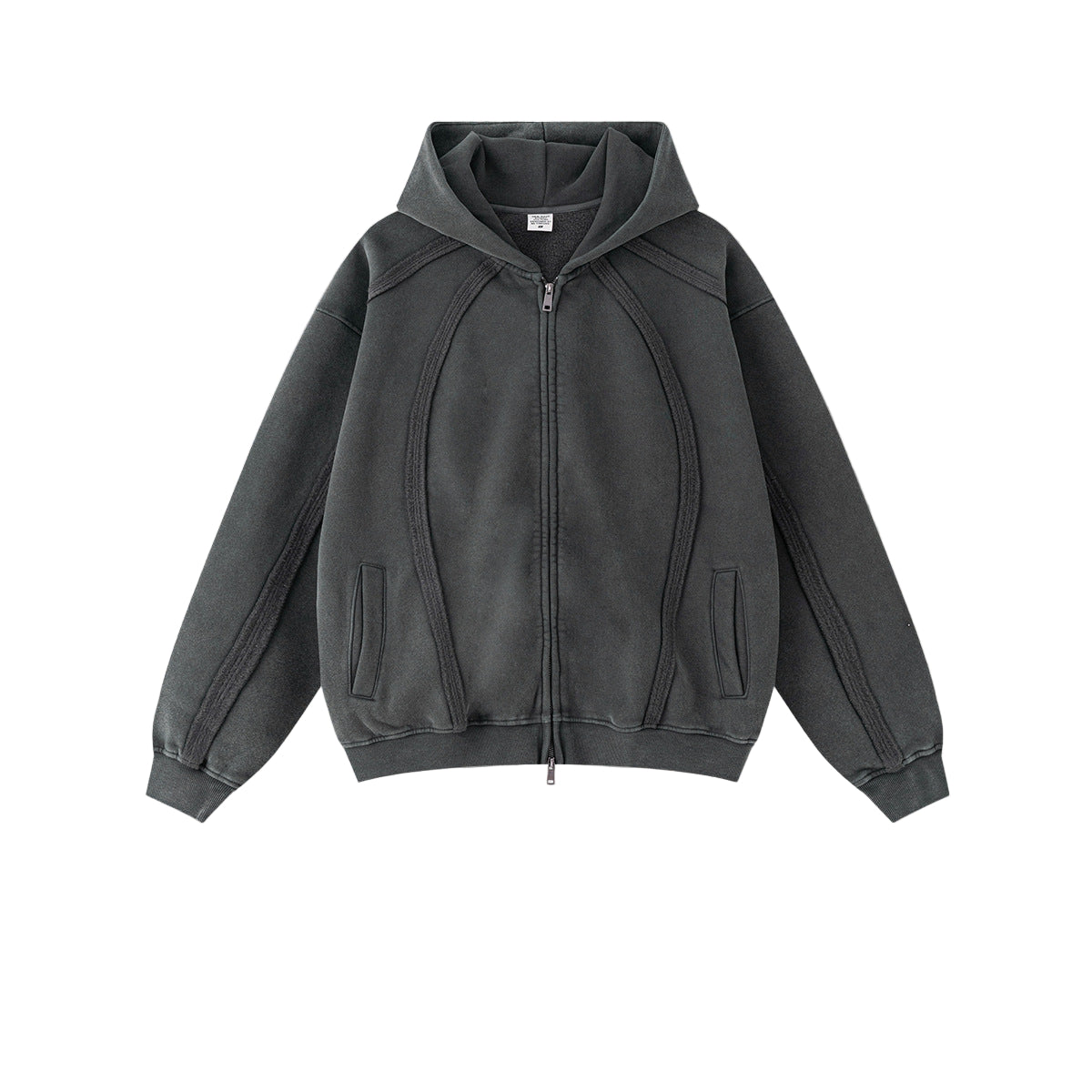 This black zip up hoodie is fleece-lined for heat and cut with sculpted panel seams that sharpen the silhouette. A two-way metal zipper lets you vent or bundle, while deep pockets and dense rib trims keep it practical for commutes, studio time, and late nights. The cotton blend feels soft from day one; the optional snow-wash adds quiet vintage character.